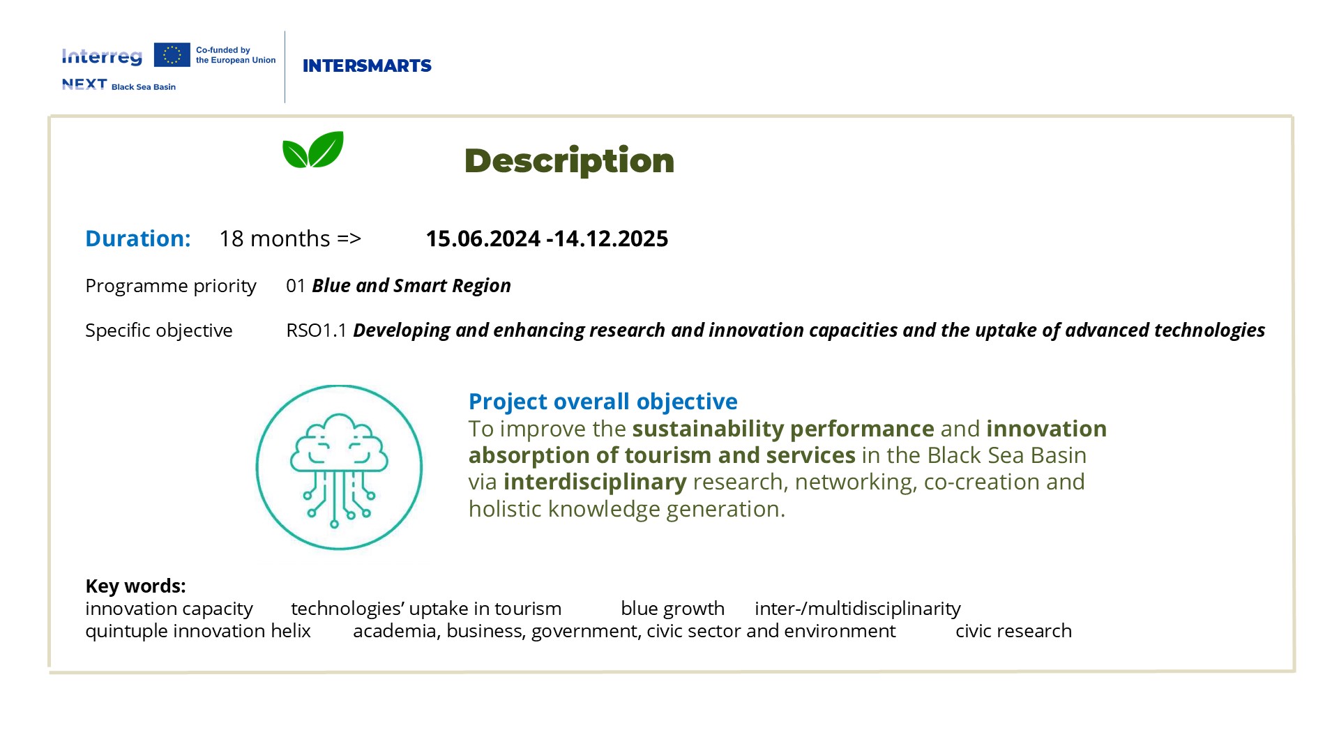 Acest model colaborativ își propune să cultive o economie bazată pe cunoaștere, care sprijină viitorul turismului în Bazinul Mării Negre. Prin implicarea tuturor părților interesate, INTERSMARTS urmărește crearea unei industrii turistice reziliente și incluzive, favorizând atât prosperitatea economică, cât și protecția mediului.