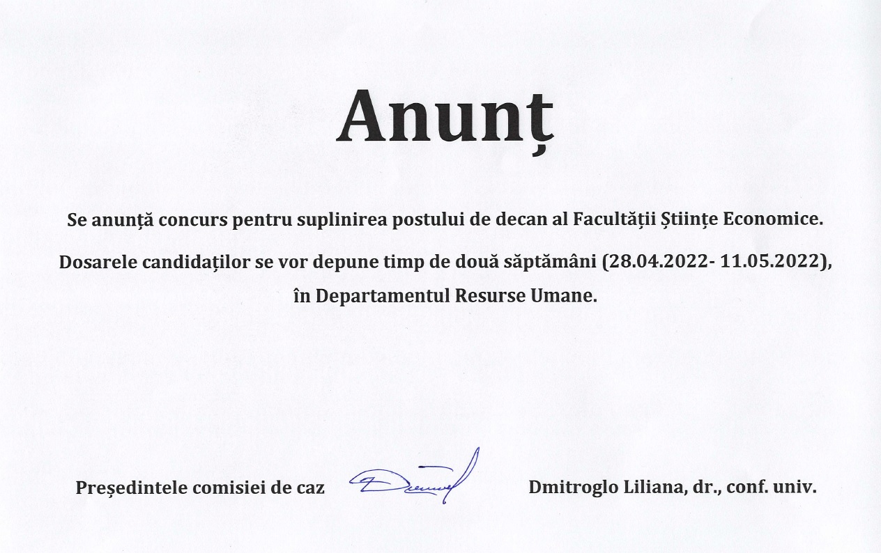 Concurs pentru suplinirea postului de decan al Facultății Științe Economice