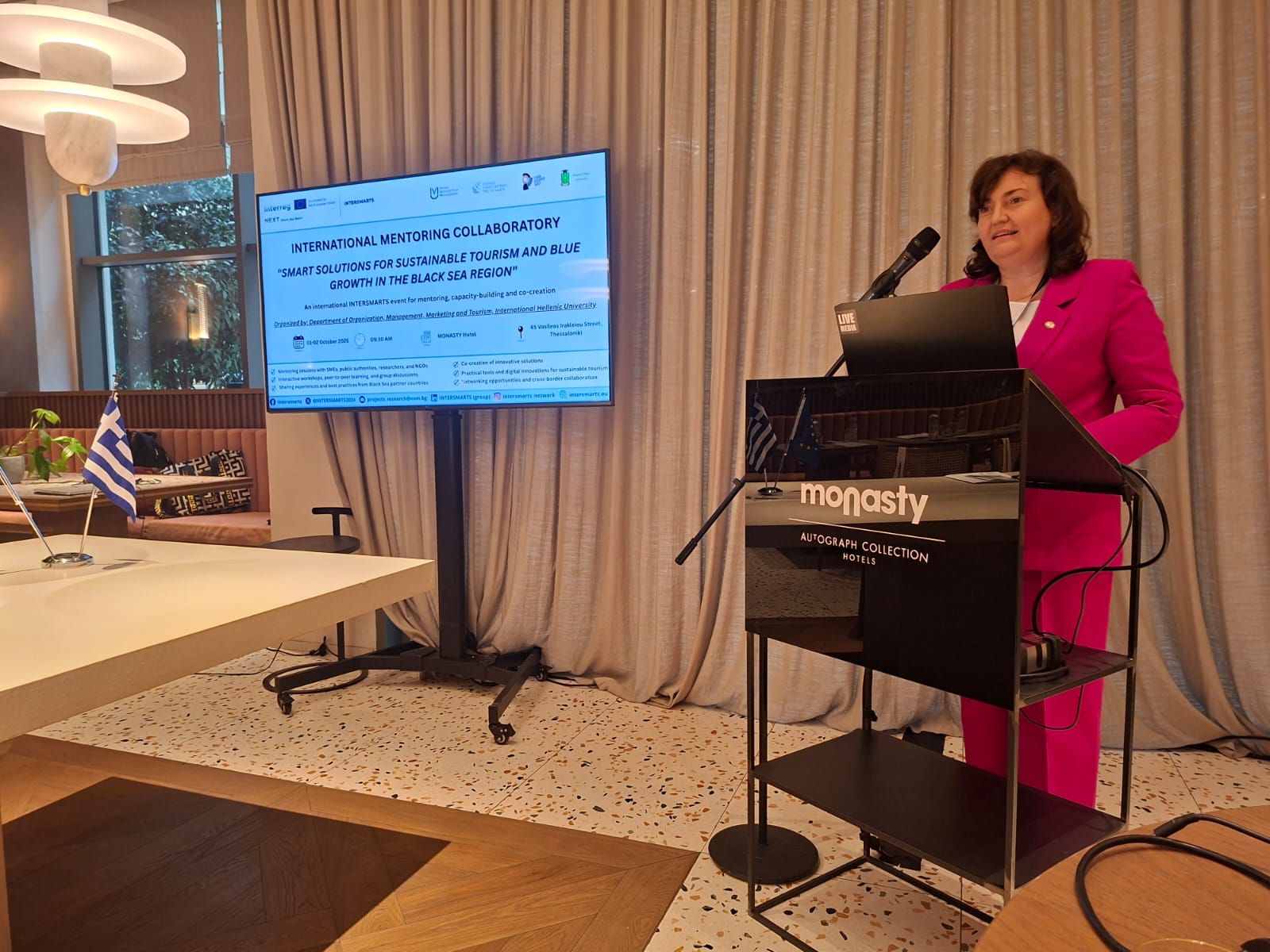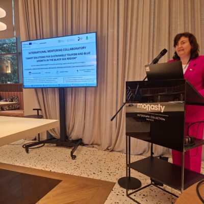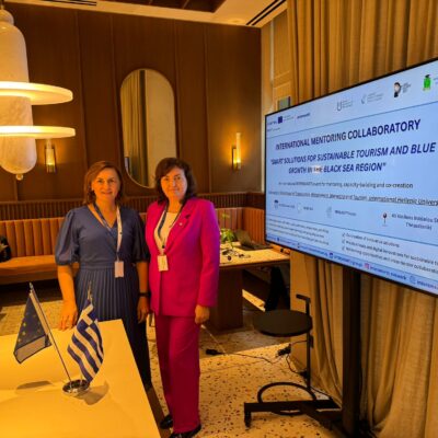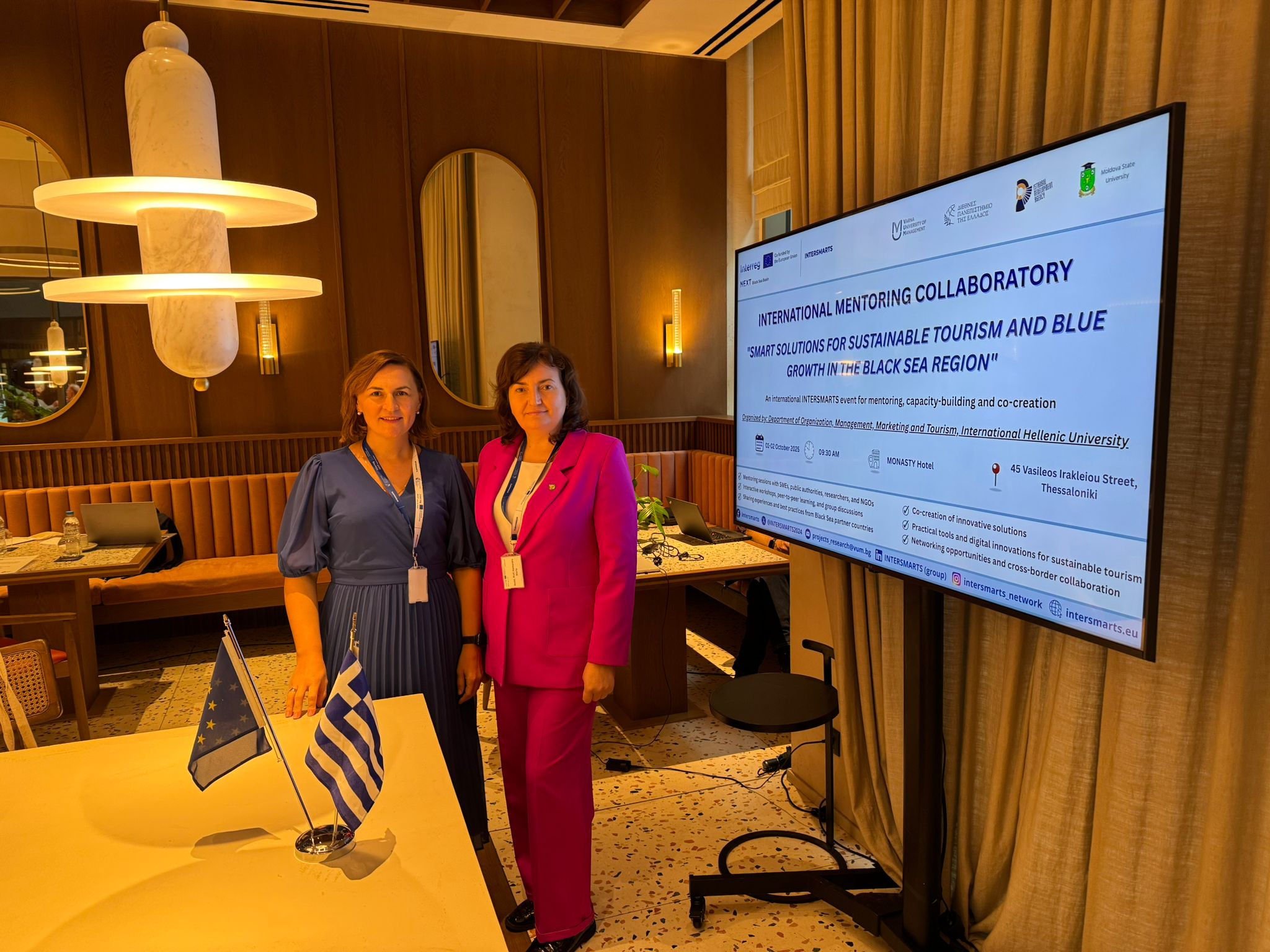 Reprezentanții Universității de Stat din Moldova (USM), Maria Hămuraru, decan al Facultatea Științe Economice, USM, și Veronica Bulat, șef al Departamentului Economie, Marketing și Turism – a participat la evenimentul internațional de diseminare a platformei inovaționale INTERSMARTS, desfășurat la Thessaloniki, Grecia, în perioada 1-3 octombrie, 2025 și organizat de către International Hellenic University. Evenimentul a reunit universități, profesioniști și reprezentanți ai mediului de afaceri interesați de inovație și sustenabilitate în turismul din Bazinul Mării Negre.