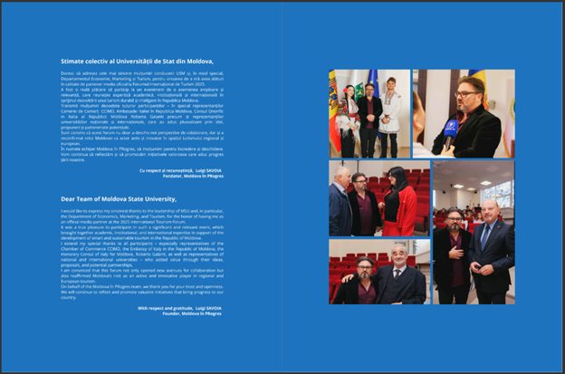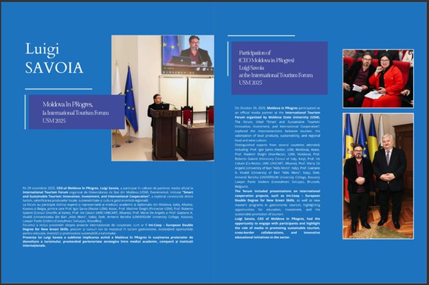 Exprimăm sincera noastră recunoștință domnului Luigi Savoia și echipei Moldova în Progres pentru prezentarea profesionistă a rezultatelor obținute de Departamentul Economie, Marketing și Turism și pentru promovarea dedicată a International Tourism Forum, organizat de Universitatea de Stat din Moldova la 29 octombrie 2025.