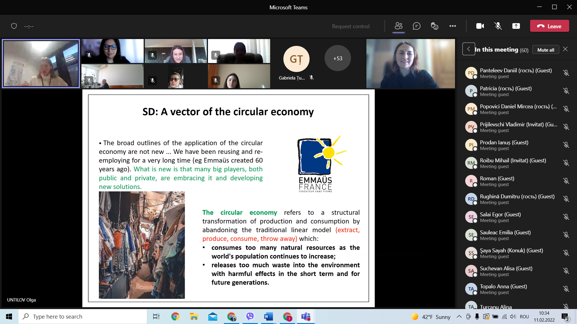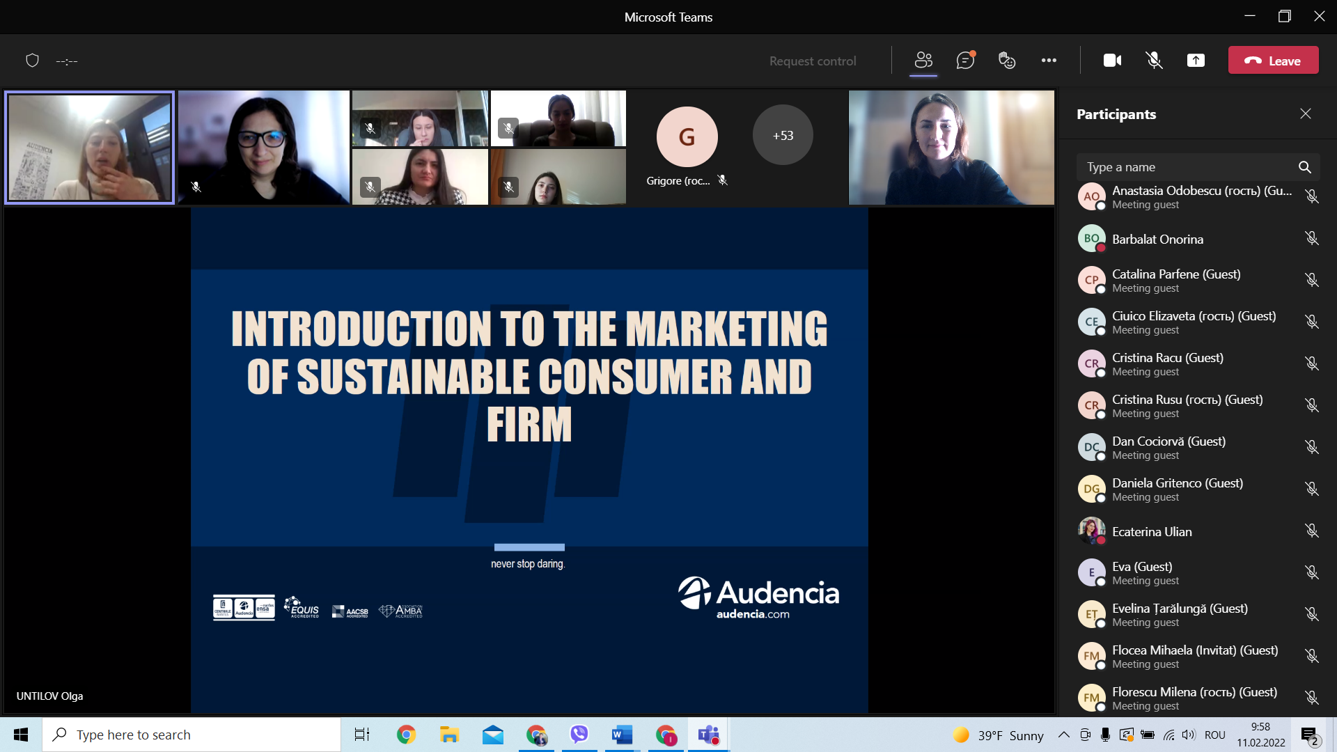 Astăzi, 11.02.2022, în cadrul disciplinei Marketing, dna Olga Untilov, Dr., lector invitat, Audencia Business School, Nantes, Franța, a susținut o lecție deschisă cu tematica Marketingul sustenabil. Seminarul a fost organizat în contextul unui program de voluntariat la care participă Dna Olga Untilov, destinat disciplinei Marketing pentru specialitățile: Marketing și logistică; Servicii Hoteliere, Turism și Agrement; Business și administrare; Contabilitate, Finanțe și bănci, anul I de studii, Facultatea de Științe Economice.